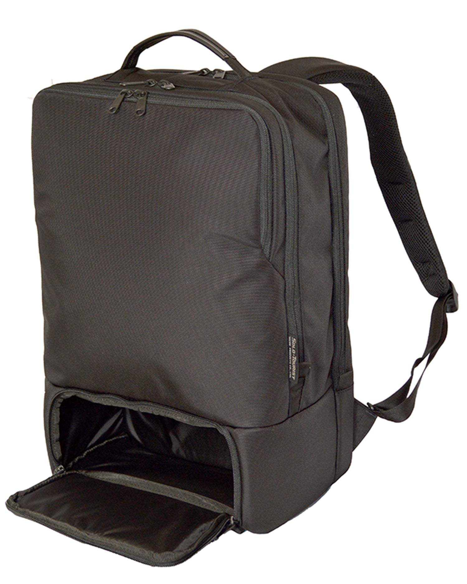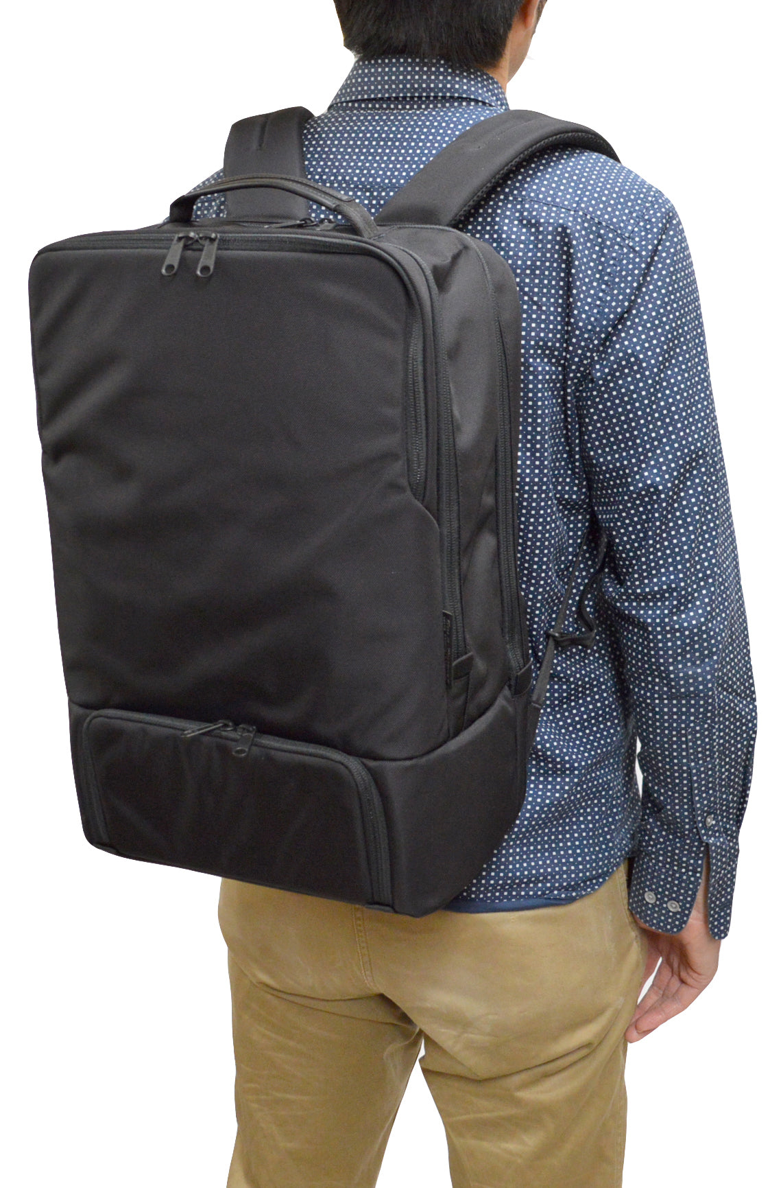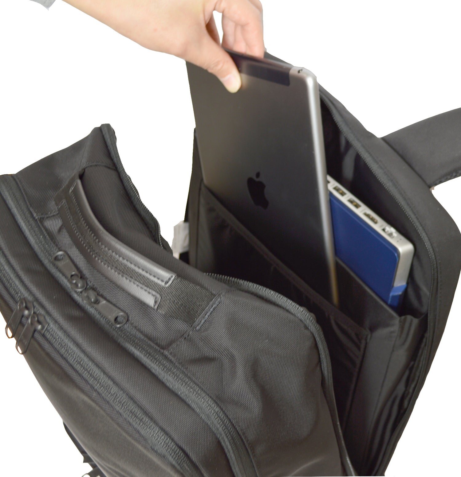 ファスナーポケットが計4個付いて、背面側のポケットには15.4インチPCの収納も可能です。天上から開閉のA4サイズが入る2個のポケットの下段には、表面から開閉の独立した下部ポケットが付いています。下部ポケットには弁当箱や着替えなどビジネスと関係しない荷物の収納に適しています。バッグ全体に裏生地との間にクッション性のあるスポンジを入れ、さらに独立した下部ポケットには硬くて薄いPVCボード入れて形を保持しています。他に文具入れポケット・キーホルダーが付いていて、把手には皮革を巻いています。