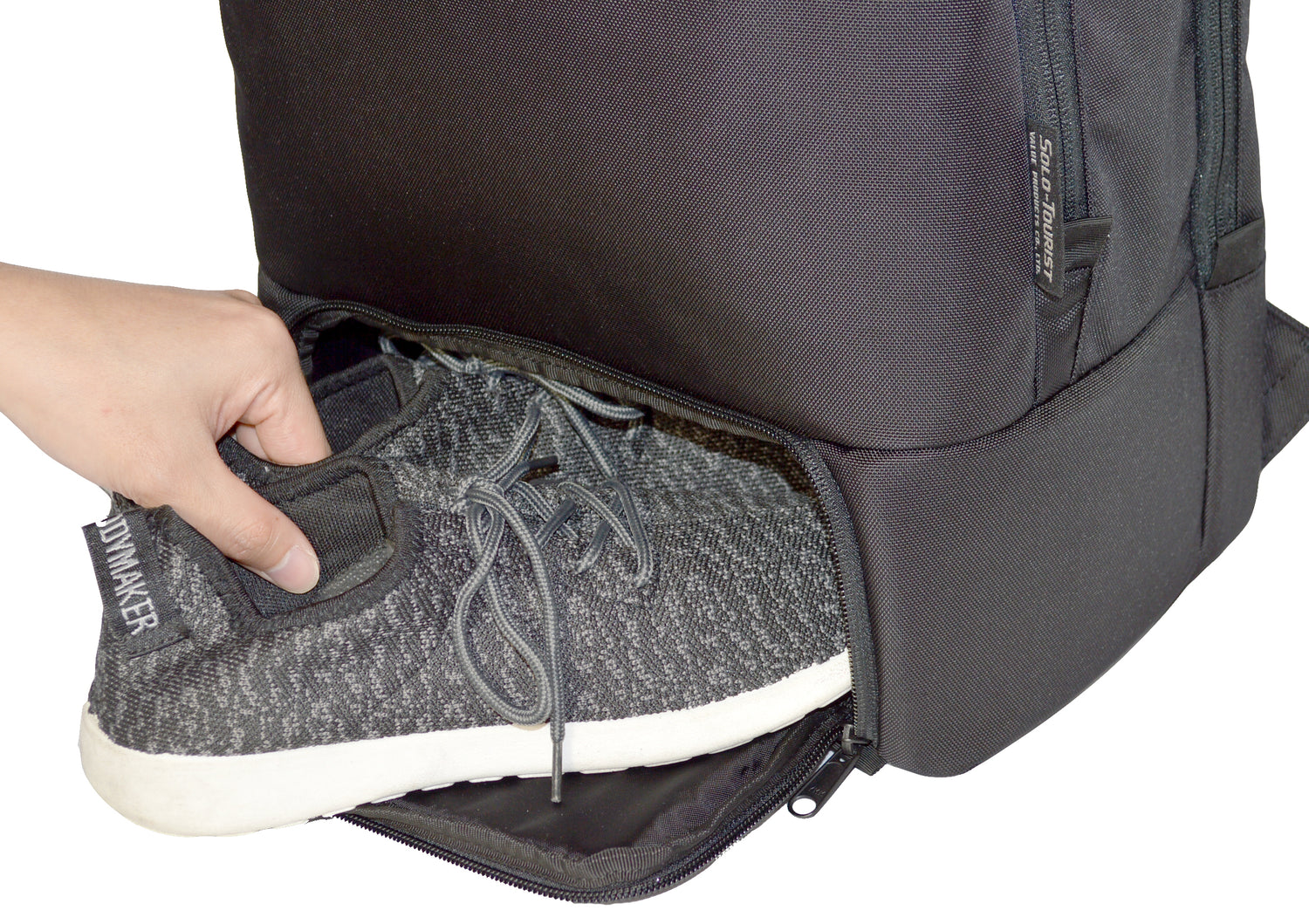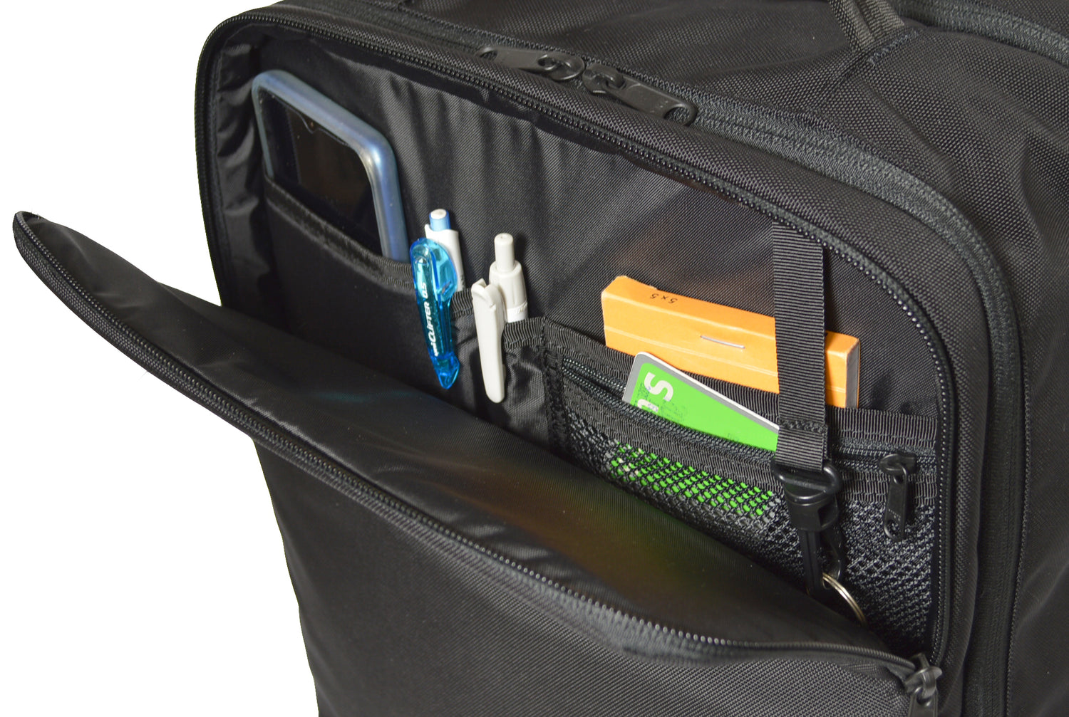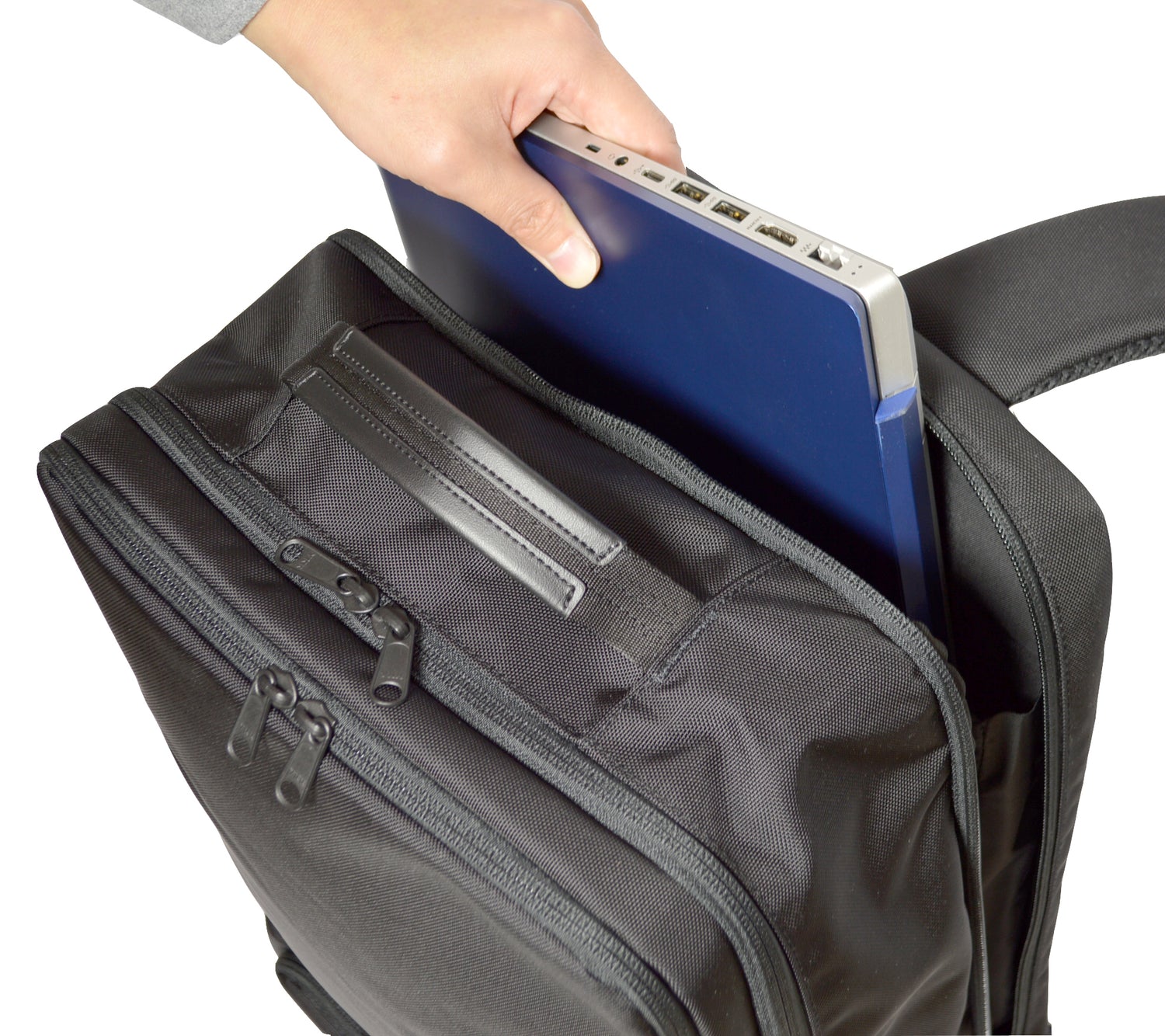 ファスナーポケットが計4個付いて、背面側のポケットには15.4インチPCの収納も可能です。天上から開閉のA4サイズが入る2個のポケットの下段には、表面から開閉の独立した下部ポケットが付いています。下部ポケットには弁当箱や着替えなどビジネスと関係しない荷物の収納に適しています。バッグ全体に裏生地との間にクッション性のあるスポンジを入れ、さらに独立した下部ポケットには硬くて薄いPVCボード入れて形を保持しています。他に文具入れポケット・キーホルダーが付いていて、把手には皮革を巻いています。