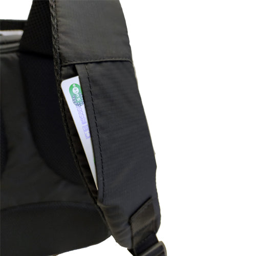 【ショルダーハーネス】 ショルダーハーネスには交通系ICカードの収納に便利なポケットがついています。